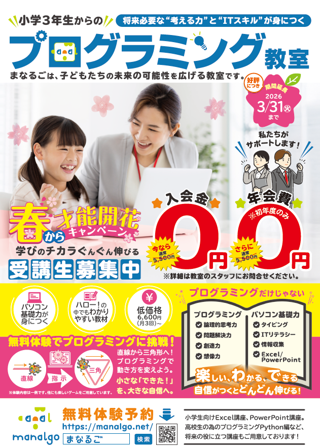 ご卒業・ご入学おめでとうございます。 また進学や進級のタイミングで新しい習いごとを検討されている方、 パソコン教室が運営するキッズプログラミング教室「まなるご」で新たな自信を身に付けませんか🌸